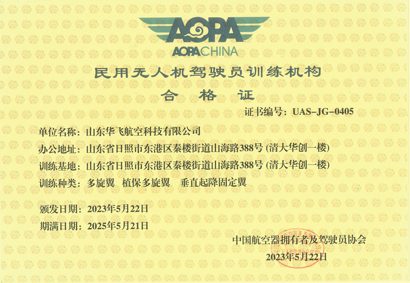 山東華飛航空科技有限公司(簡(jiǎn)稱(chēng)華飛航空)位于美麗的海濱城市—日照大學(xué)科技園區(qū)。企業(yè)注冊(cè)資金300萬(wàn)元。華飛航空是經(jīng)中國(guó)航空器擁有者及駕駛員協(xié)會(huì)(AOPA)審定合格的無(wú)人機(jī)培訓(xùn)機(jī)構(gòu)。擁有中國(guó)民航局多旋翼無(wú)人機(jī)視距內(nèi)操控員、超視距操控員、垂直起降固定翼超視距操控員、植保機(jī)無(wú)人機(jī)操控員駕駛執(zhí)照和 AOPA 民用無(wú)人機(jī)Ⅰ類(lèi)、Ⅱ類(lèi)、Ⅲ類(lèi)、Ⅴ類(lèi)植保操控員合格證培訓(xùn)資質(zhì)。是山東省日照市退役軍人事務(wù)局審核、批準(zhǔn)的退役士兵無(wú)人機(jī)職業(yè)技能技術(shù)培訓(xùn)定點(diǎn)培訓(xùn)機(jī)構(gòu)。